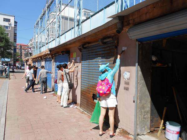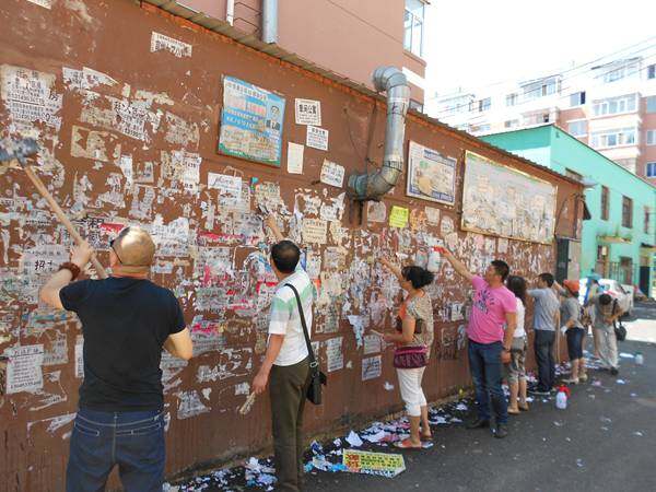 为了创建美好家园,清除城市“牛皮癣”,2015年7月15日一大早,牡丹江市农业机械化技术推广站全体职工在于松林站长的带领下来到市农机局帮扶单位--牡丹江市西安区东丹社区,和社区干部们一起“全副武装”深入社区的大街小巷,向市民们深恶痛绝的一块块城市“牛皮癣”发起了猛攻。